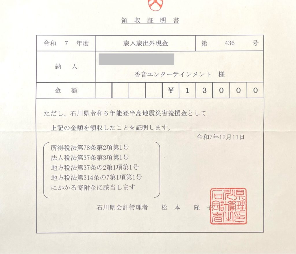 石川県令和6年能登半島地震災害義援金とさせていただきました。